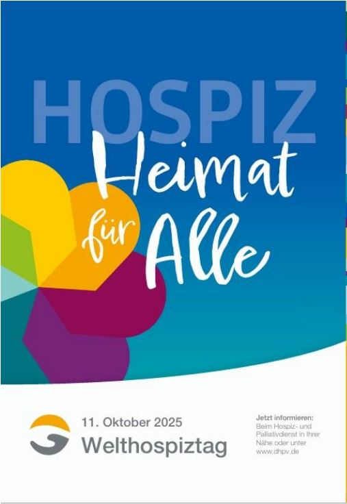 Für den diesjährigen Welthospiztag am 11. Oktober hat der Deutsche Hospiz- und PalliativVerband (DHPV) das Motto „Hospiz - Heimat für alle" erdacht. Es soll damit Solidarität mit geflüchteten Menschen gezeigt, die Willkommenskultur betont und zugleich Vielfalt im Sinne von Interkulturalität im Ehrenamt thematisiert werden.