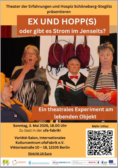 Wer das Stück "Ex und Hopp(s) oder Gibt es Strom im Jenseits?“ in der Refo-Kircher Moabit verpasst hat, kann das jetzt im Mai in Tempelhof nachholen: Das Stück in Kooperation des Theaters der Erfahrungen mit dem Ambulanter Hospizdienst Schöneberg-Steglitz thematisiert das Lebensende auf ganz eigene Art und Weise und mit einem großen Augenzwinkern.