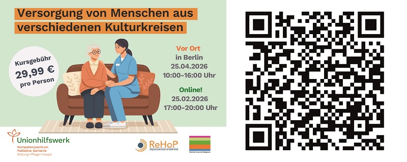 Für den gemeinsamen Kurs "Kultursensible Hospiz- und Palliativarbeit für Mediziner und Pflegekräfte" der Zentralen Anlaufstelle Hospiz und des Kompetenzzentrums Palliative Geriatrie gibt es noch freie Plätze.