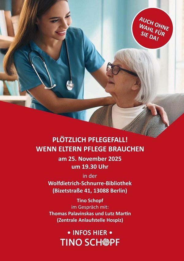 Antworten auf diese und viele weitere Fragen gibt es am Dienstag, 25. November 2026, in der Wolfdietrich-Schnurre-Bibliothek in Weißensee. In der von Tino Schopf (SPD), Mitglied des Abgeordnetenhauses von Berlin für Prenzlauer Berg Ost und Weißensee, organisierten und moderierten Veranstaltung stehen Thomas Palavinskas und Lutz Martin von der Zentralen Anlaufstelle Hospiz (ZAH) Rede und Antwort. Besprochen werden u. a. folgende Fragen: